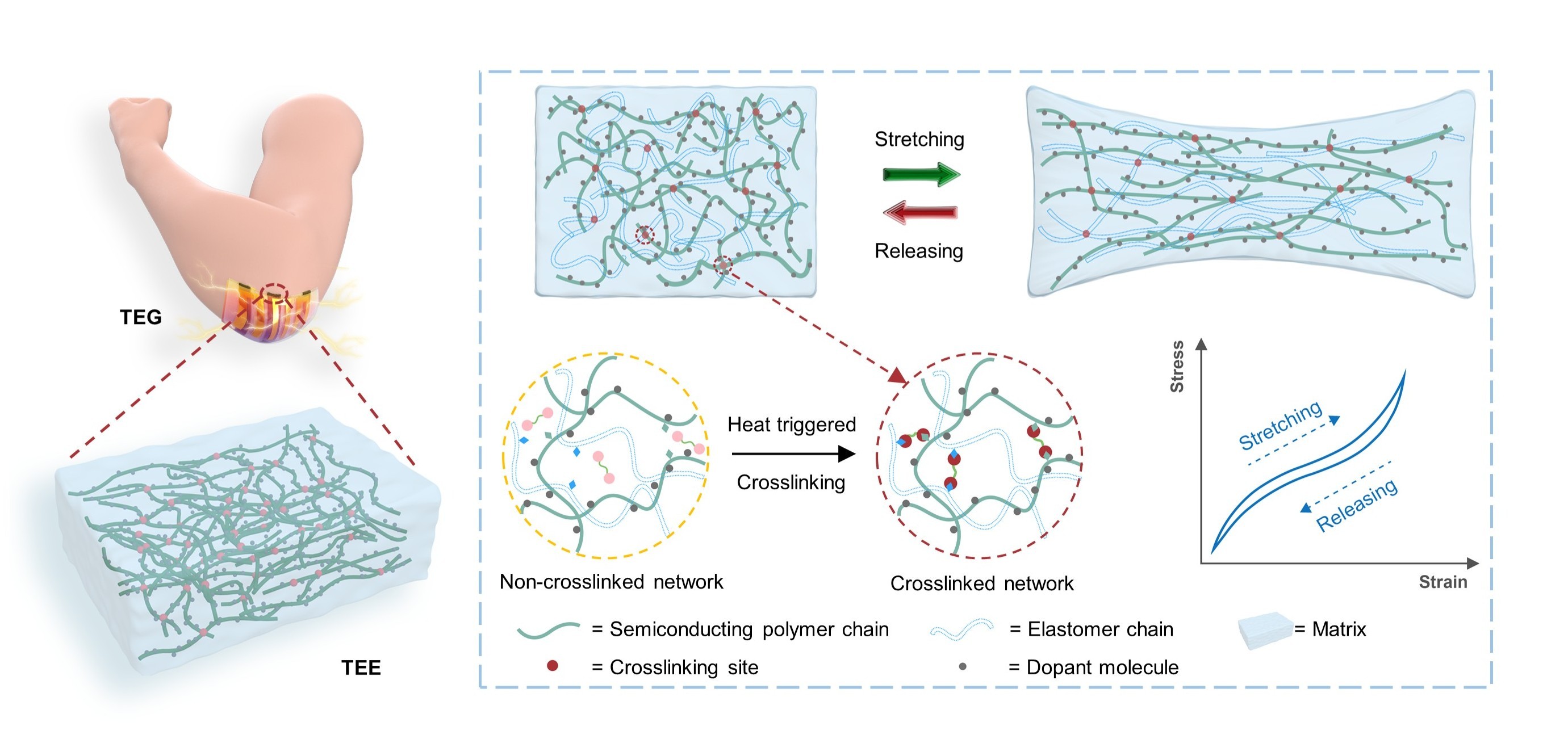 随着可穿戴电子设备和软生物电子学的飞速发展,如何提供高效、灵活的能源解决方案已成为亟待解决的关键问题。热电发电技术作为一种能够将温差转化为电能的有效方式,已展现出广泛的应用前景。然而,传统热电器件多采用无机热电材料,侧重于在刚性结构下的应用,缺乏弹性和形状适应性,在柔性和可穿戴设备中应用上受到显著限制。针对这一问题,刘凯开发了首个N型热电弹性体(TEE),一种兼具弹性、伸展性和热电转化能力的创新材料,为上述领域的能源采集技术开辟了新的方向。
